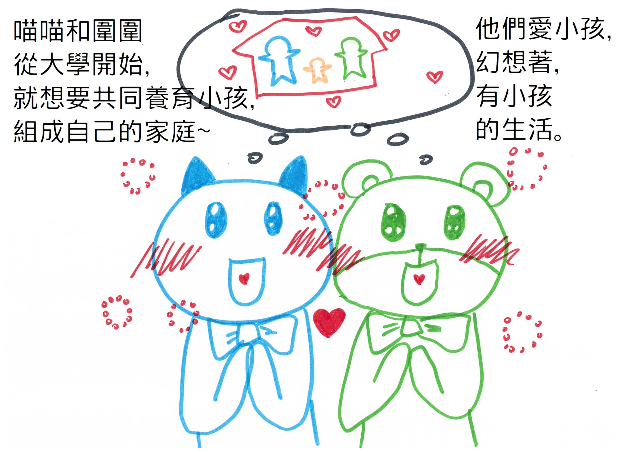 在多數人對「家庭」的既定印象裡,兩位爸爸與一名孩子的組合仍屬少見。對圍爸與喵爸而言,這樣的家庭型態,起初也只是遙不可及的夢想。圍爸從小就喜愛小孩,曾幻想開育幼院,並在母親擔任保母的環境中耳濡目染,體會到照顧孩子的溫暖。而喵爸雖起初覺得「同志收養」難以實現,但因著對伴侶的愛與共築家庭的渴望,兩人從交往初期便開始討論「要不要孩子」的課題。相較於代孕需高額費用與跨國奔波,我們選擇了在台灣收養的路徑。雖然前方困難重重,但我們願意一起走下去,實踐「以愛成家」的信念。