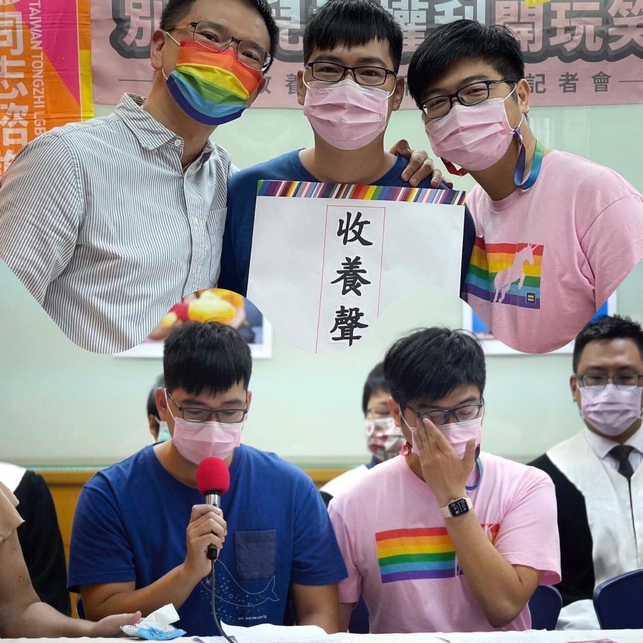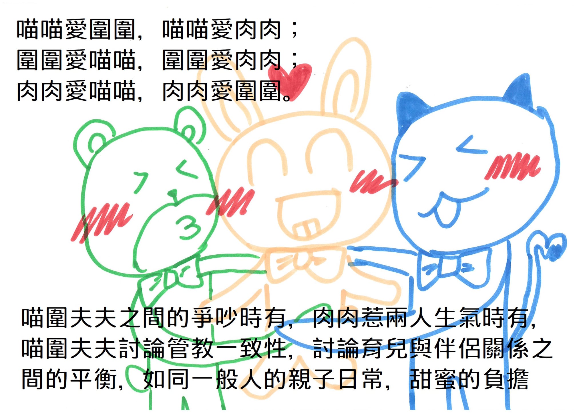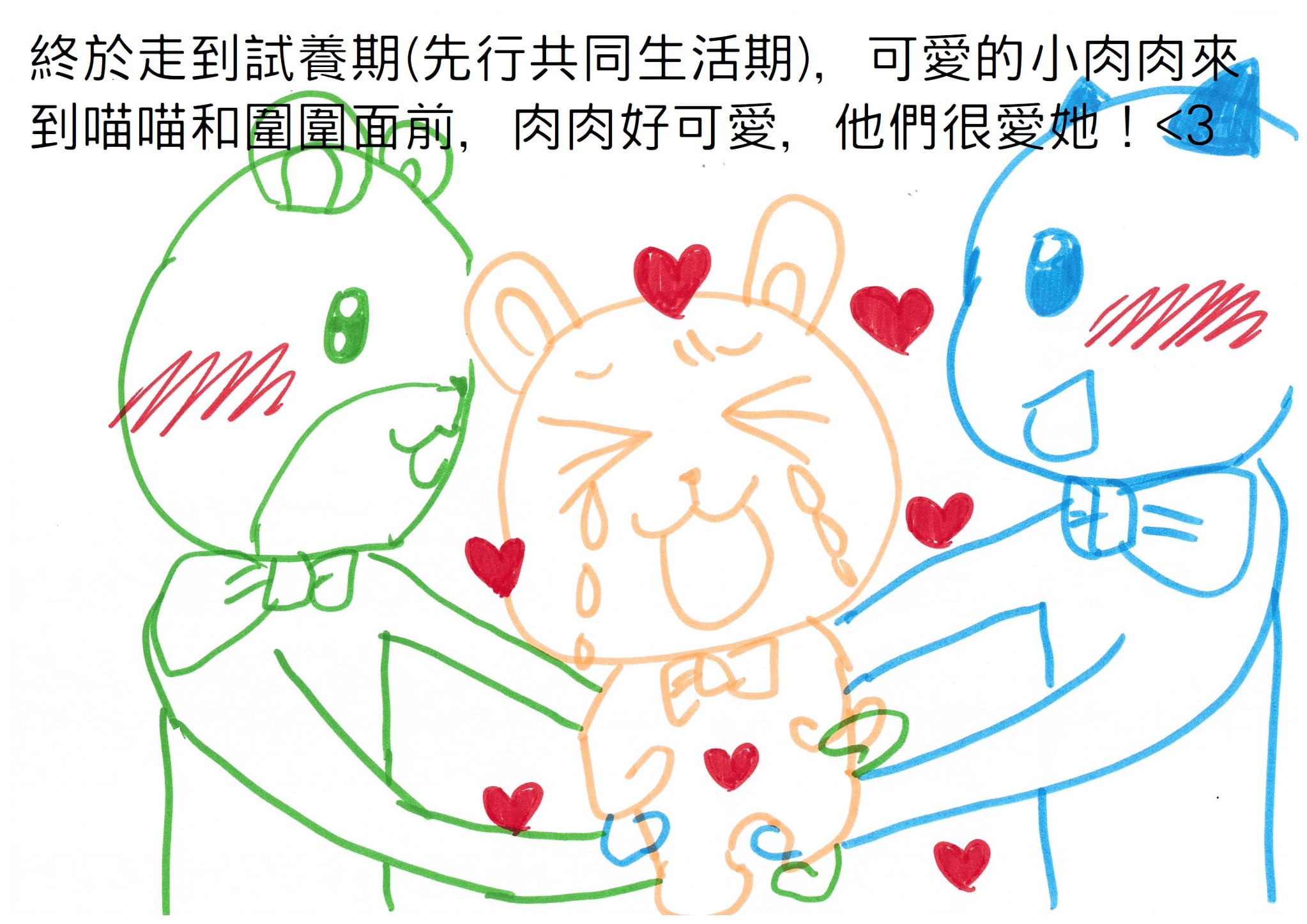 然而,愛不等於一切就順利。由於當時法律未明確保障同志伴侶共同收養無血緣子女的權利,喵爸必須經過兩年訴訟,才能取得與圍爸同等的親權地位。這段時間,我們不僅要面對訴訟壓力,更要承擔身分不對等可能對家庭造成的風險與不安。但我們選擇堅持,並持續對外發聲,參與多場演講與倡議,希望讓社會理解同志家長的真實與努力。終於在 2022 年,喵爸收養裁定通過,一家三口在法律上終於獲得平等認可。這個結果不只是對我們個人的肯定,更象徵著同志家庭在台灣法律與社會地位上的重要一步。如今的他們不僅是肉肉的爸爸,更是同志家庭可見化的重要典範。我們用行動證明:家,不一定需要血緣;愛,就是最穩固的連結。