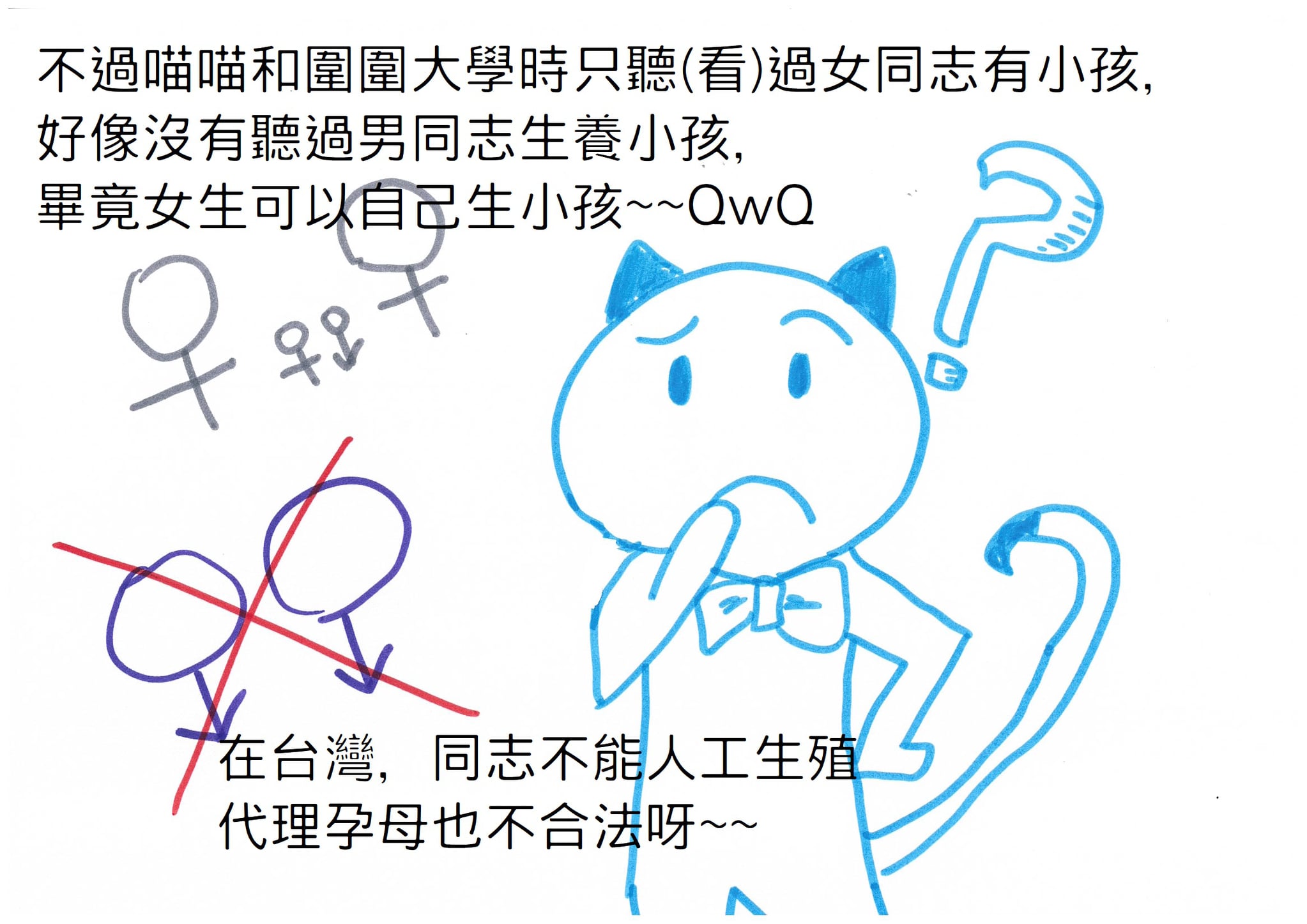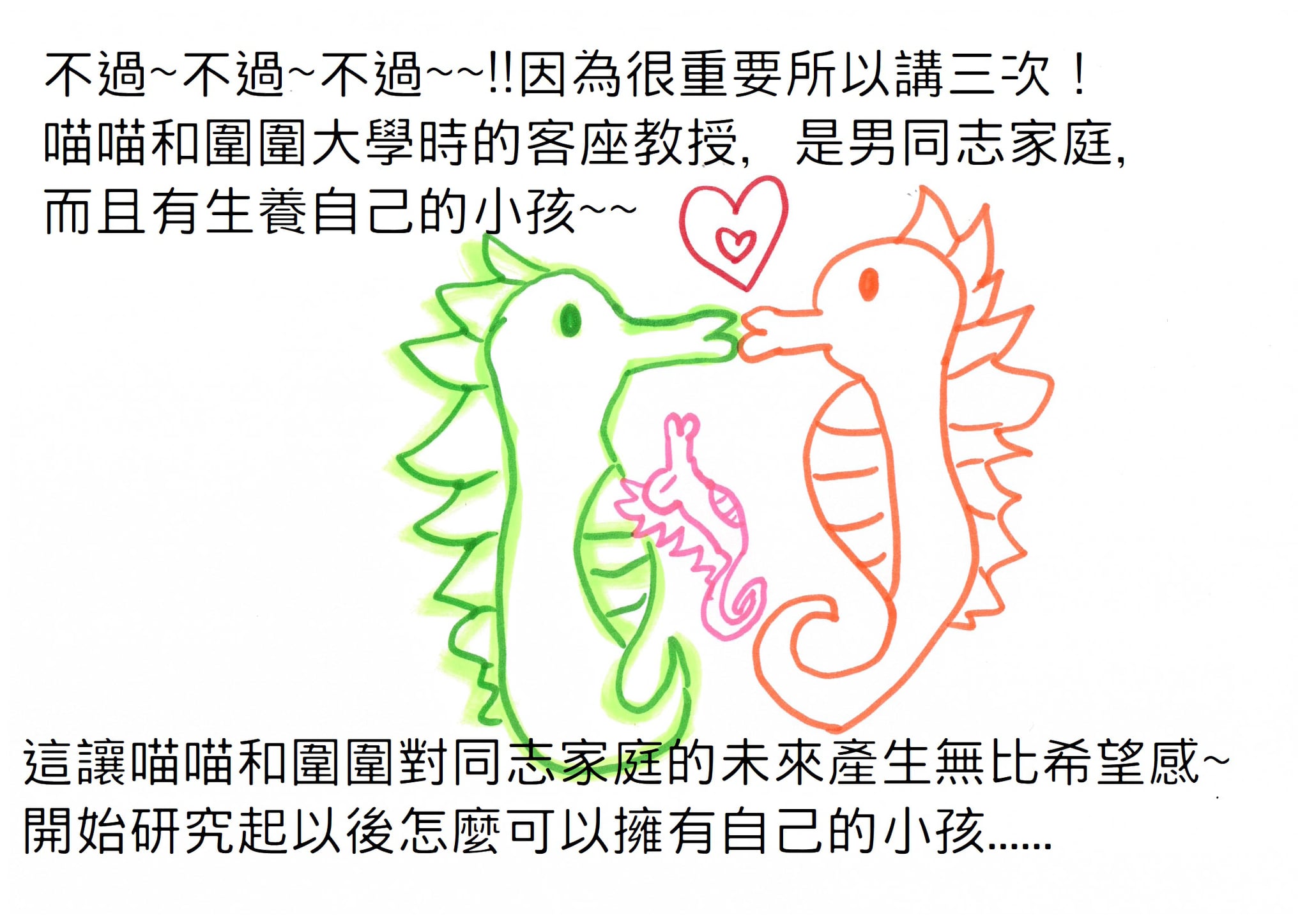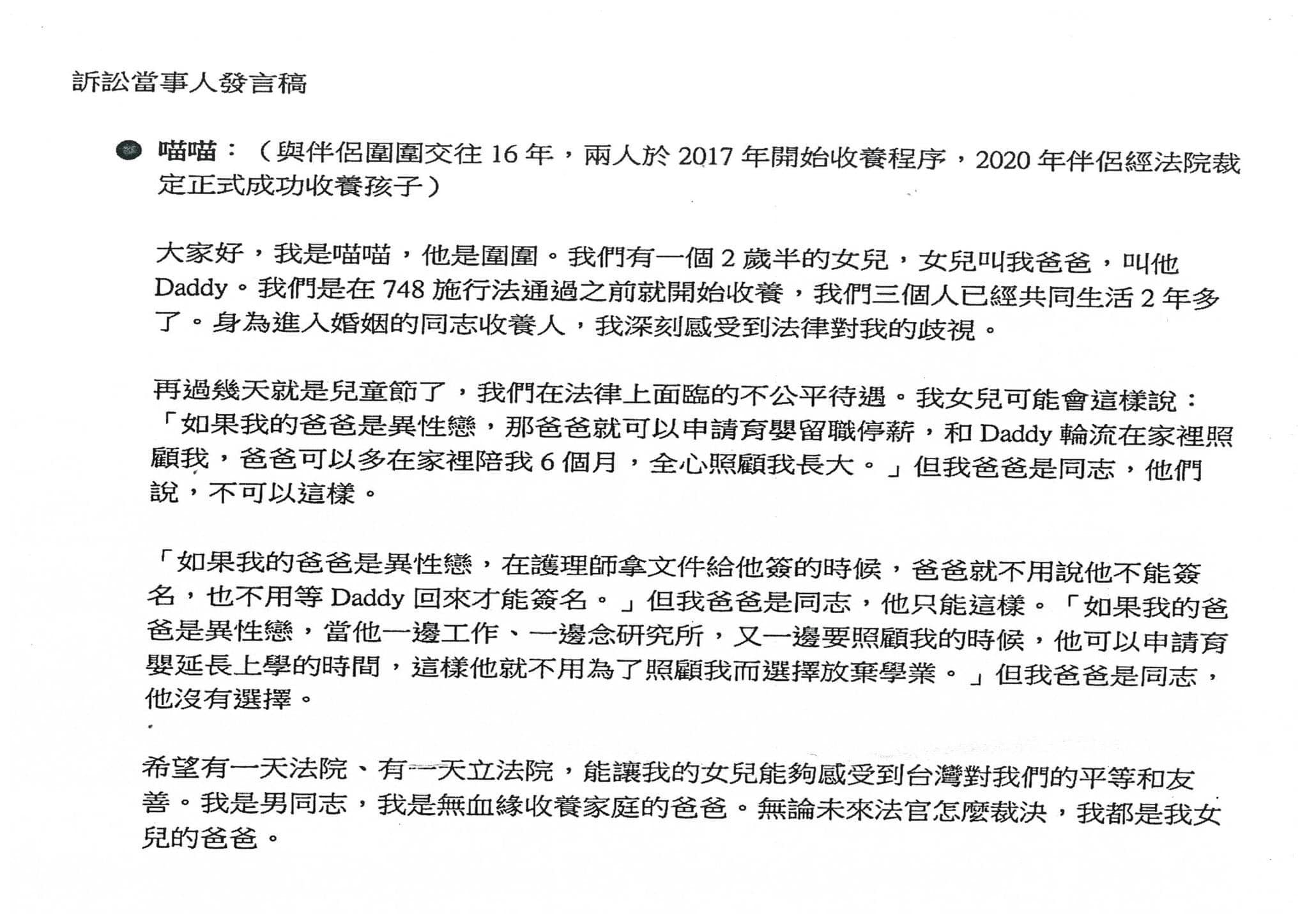 然而,愛不等於一切就順利。由於當時法律未明確保障同志伴侶共同收養無血緣子女的權利,喵爸必須經過兩年訴訟,才能取得與圍爸同等的親權地位。這段時間,我們不僅要面對訴訟壓力,更要承擔身分不對等可能對家庭造成的風險與不安。但我們選擇堅持,並持續對外發聲,參與多場演講與倡議,希望讓社會理解同志家長的真實與努力。終於在 2022 年,喵爸收養裁定通過,一家三口在法律上終於獲得平等認可。這個結果不只是對我們個人的肯定,更象徵著同志家庭在台灣法律與社會地位上的重要一步。如今的他們不僅是肉肉的爸爸,更是同志家庭可見化的重要典範。我們用行動證明:家,不一定需要血緣;愛,就是最穩固的連結。
